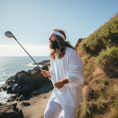 Jesus wearing Malbon Golf apparel hitting a driver off of a beautiful seaside course