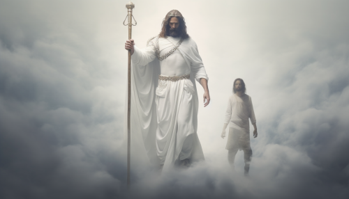 jesus christ stands with lucifer who looks like darkly dressed human, fullbody in the end of the world, hyper realistic image, 8k image, canon r5, super sharp details, realistic photo --ar 7:4 --v 5.1 --s 750