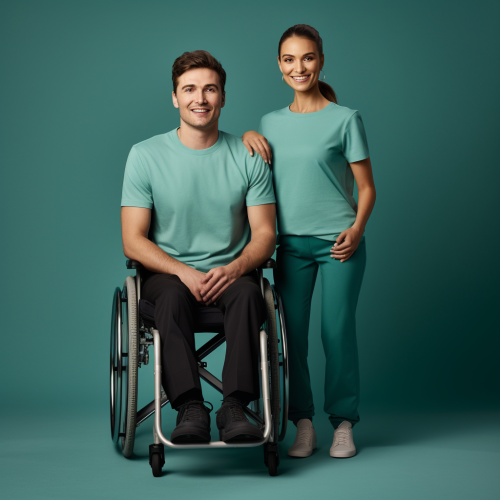 caregiver, helping someone stand up from wheelchair, short sleeve t-shirt, studio photography, teal background