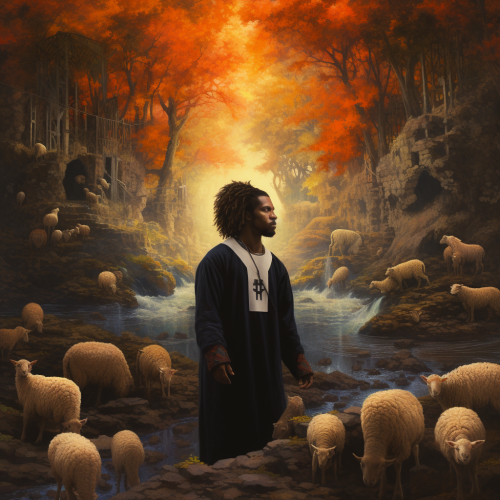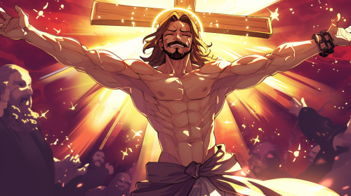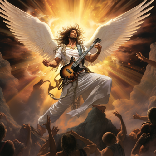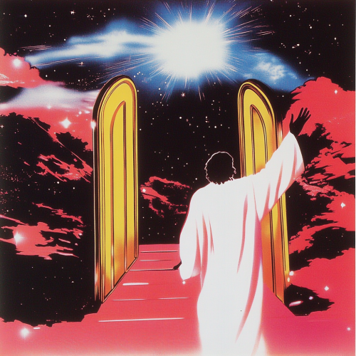 Jesus in white robes waving at Heaven’s gold gates doors centered. Leading into the sky. Beautiful fever dream. Epic album cover art --v 6.1 --sref 662824061 --p dg2k8l2 --ar 1:1