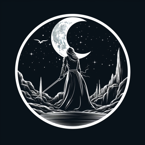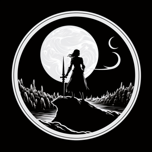 a circular logo with elvish border containing a female elven warrior holding a broadsword leading the charge towards iron gates. Moon in sky. Rear pov. Single color in white with black background.