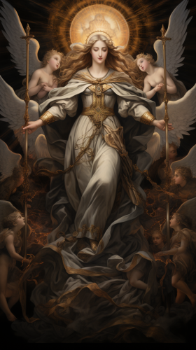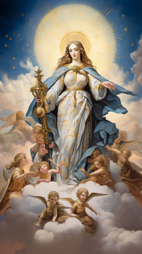 image of Mary, mother of Jesus, in the center, with 3 angels in armor around her, background sky --ar 9:16