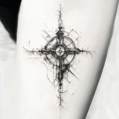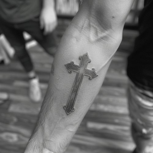 create a simple black and grey realism tattoo of a cross. Forearm. 7 inches.