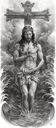 jesus + cross, black and grey tattoo design chicano style, hyperrealistic, full image, no pencils, jpeg artifacts, 4k, anatomically correct, ccurate, textured skin, super detail, high details, award winning, no body tattoo, best quality, high quality, 1080P, retina, HD, 16k --style raw --s 750 --niji 6 --no imperfections --ar 7:16