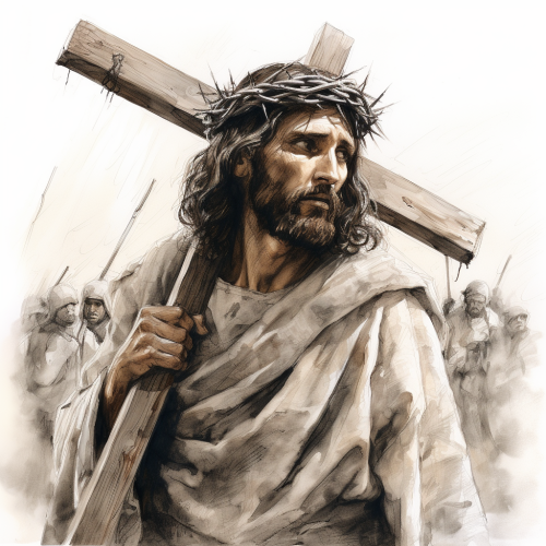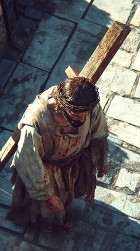 aerial view, HDR ,cinema 4d, ultra-high definition resolution, glowy image, golden hour, 32k,realistic photo, Jesus carrying the cross through a narrow street, His face showing both determination and suffering.. , clear and detailed – golden hour, perfect, shot in the style of Ansel Adams, captured with a Hasselblad H6D-400c. --ar 9:16 --stylize 150 --v 6.1 --style raw