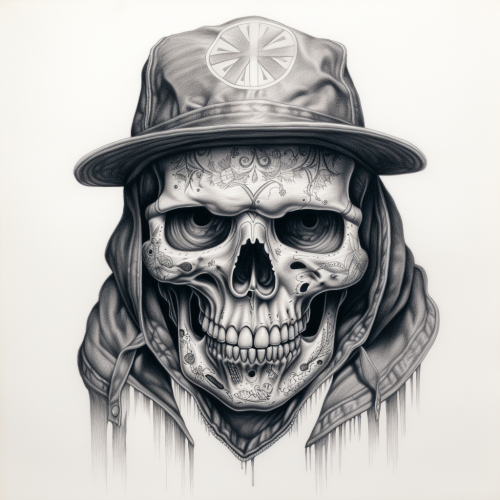 Chicano gangster styled skull wearing a hat and bandana, pencil drawing on white paper