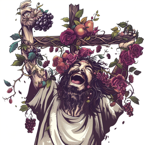 hippy looking jesus with a big smile on his face holding up the bottom of a gnarly cross wrapped in vines and fruit and roses high above his head, highly detailed t-shirt design, white transparent background