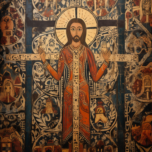 jesus holding the key of solomon cross on his back, ancient civilization, kalamkari ,
