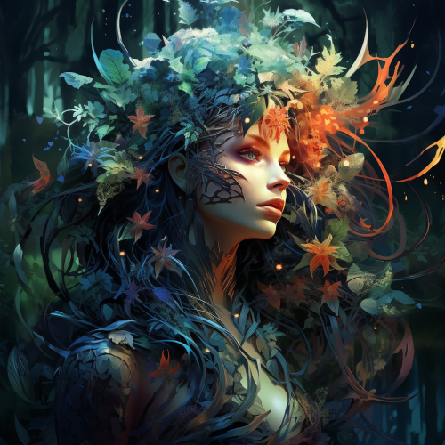 . She has been there so long that the forest has grown all around her and has partly enveloped her. High detail. Futuristic fantasy style. Vivid colours and magical feel. --s 250