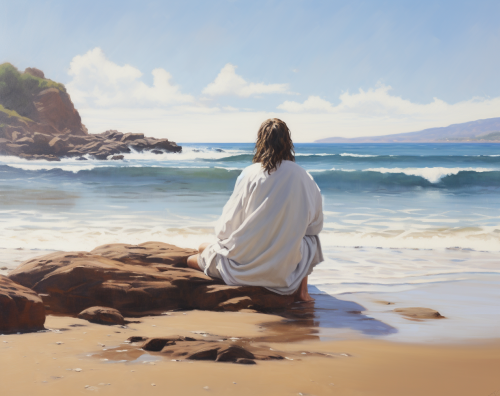 Oil painting of Jesus sitting on a sandy beach looking out over the ocean --ar 14:11