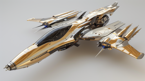 Hyperrealism rendered in Unreal Engine 5 model of a long futuristic space fighter, that has elements of a fighter jet, with an armored design and high-tech features, long wings, and a drone-like body. Colors beige, copper, and metal alloy 40 megapixeles, show-case. --style raw --ar 16:9 --v 6.0