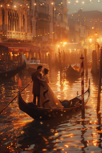 realistic, A couple gliding through the canals of Venice in a gondola, the woman wearing a beautiful, flowing dress and the man dressed elegantly. The water reflects the warm lights of the surrounding buildings, and they look into each other's eyes as the gondolier softly sings a romantic tune --v 6.0 --ar 2:3