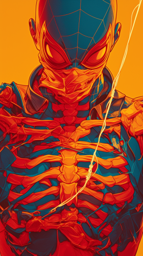 Spiderman, male, marvel,an intaglio print in cerulean blue transparent skin male masculine muscular model with , partial overlay with a drawing of a skeleton in scarlet red intaglio print, yellow accents, intaglio dotted texture, art editorial, solid color studio background, printmaking, fine art print, half body shot, flat studio background, 4k,fantasy concept, folklore details, hyper-detailed --niji 6 --ar 9:16