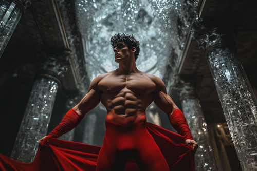 incredible meaningful surreal tumblr amateur palace fashion photoshoot of full-sized beautiful gorgeous muscular model man with handsome face, rich futuristic red leisure suit, ultra detailed full body, dynamic superhero pose, in a crystal palace, interesting poses, photorealistic, photoshoot, cinematic still shot, magazine photography, 35mm, film look, 8k, hd --ar 3:2 --p kaau5gb