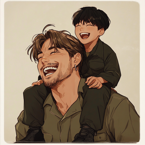 cartoon illustrated Polaroid image of a very muscular thick man, medium length dark blonde hair, stubble, Taylor kitsch facial features, sage green shirt, with a young Korean man sitting on his shoulders, choppy black hair, Jungkook facial features, wearing a black boilersuit. Both laughing.
