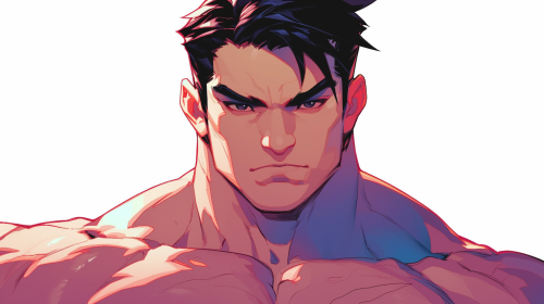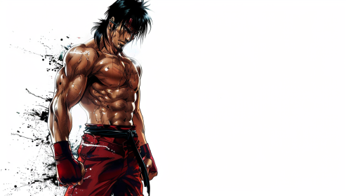 Jin Kazama, short black haired muscular asian man, white background --niji 6 --ar 16:9