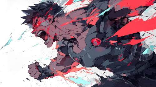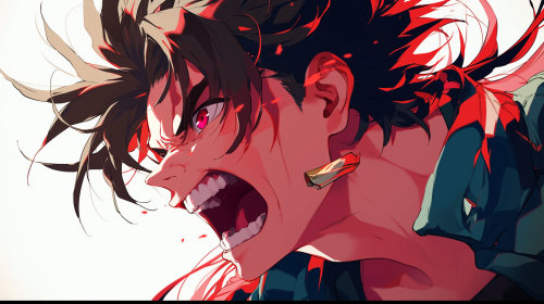 Jin Kazama screaming, red left eye, clean lines, white background --niji 6 --ar 16:9