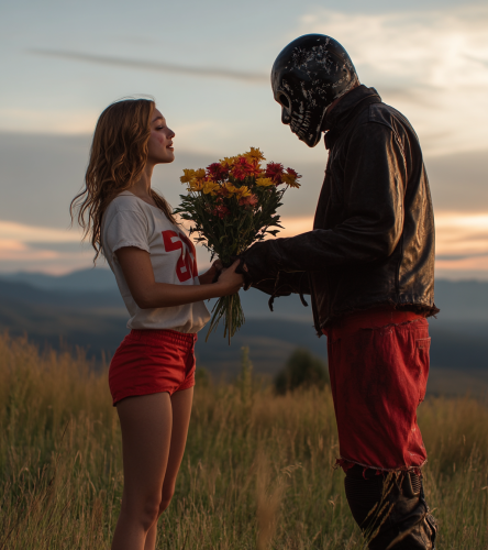 "A lifelike depiction of Lord Krishna at around 28 years old, standing in a serene meadow during dusk, with a soft golden sunset illuminating the scene. His skin has a rich dark brown hue with a subtle bluish tint, giving him an ethereal, divine glow. Krishna’s face reflects youthful maturity, with wide lotus-shaped eyes full of compassion and wisdom, and a gentle, charming smile. He wears a gold crown adorned with a peacock feather, adding a touch of divinity and royalty. Draped in a flowing yellow silk garment, Krishna stands gracefully, holding a flute in his hands. A calm white cow with soft brown eyes stands beside him, exuding peace and affection. The background features a gently flowing river, tall trees, and colorful wildflowers swaying in the soft breeze, creating a tranquil, divine atmosphere that feels alive with Krishna’s celestial presence." --s 750 --style raw