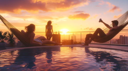 hyper realistic photo, three friends on a rooftop at sunset, one is lying in a hammock, another lying on a lounge chair and another taking a soda from a cooler, the situation is at sunset on the terrace of a building, we see an inflatable pool In front of them, in the background there are more people dancing, the situation is very well lit with natural light. 75 mm lens, production quality, depth of field, cinema photography, color grading, exquisite detail, sharp-focus, intricately-detailed, long exposure time, f/2.8, diffuse-back-light, award winning photography, hyper realistic, unreal engine, realistic lense flare, Cinematic Lighting, Studio Lighting, Beautiful Lighting, Accent Lighting, Global Illumination, Ray Tracing Global Illumination, Ray Tracing Reflections, Lumen Reflections, Screen Space Reflections, Anti-Aliasing, FKAA, TXAA, RTX, SSAO, Shaders , OpenGL-Shaders, elegant, 4K, --ar 16:9