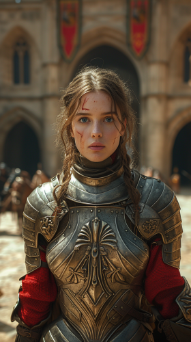 a fully body pose of a blonde anime teenage Joan of Arc, her armor is worn from battle, she is kneeling and facing the camera with a serious expression, her hair is a bob cut, one of her hands is moving her hair away from her face. --niji
