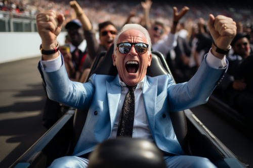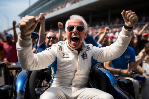 joe biden as formula one driver cheering after the race, he's sitting in formula car, photorealistic, real photo, canon photography --ar 3:2 --s 250