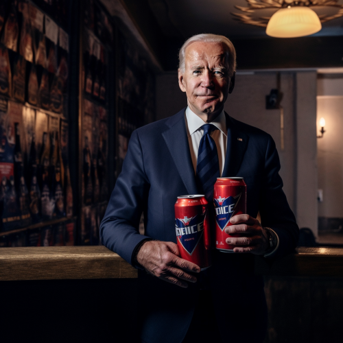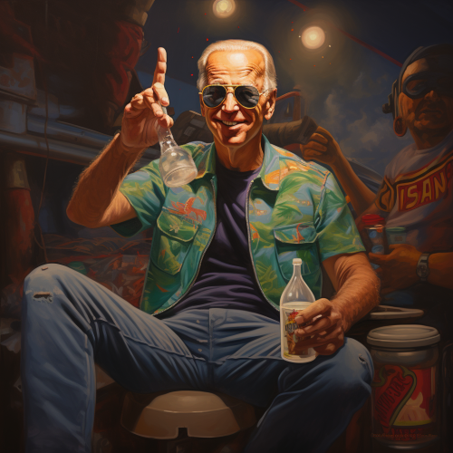 Joe biden wearing jorts, holding a big gulp from 7 eleven putting up gang signs