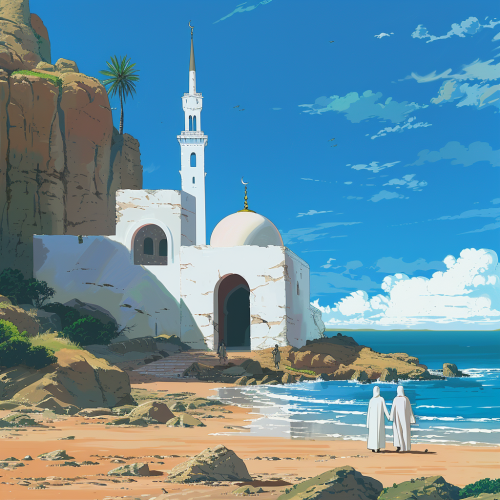 An african savannah coast by the seaside. In the distance there is only one small humble mosque in the style of a white mykonos house. The mosque is white and very humble-looking. Ghibli studio style animation.