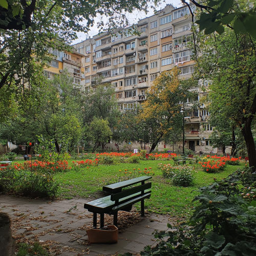 a nice park between building blocks, in bucharest. Communist blocks behind, but well maintained, the park is full of life, with kids playing, lots of flowers and trees.
