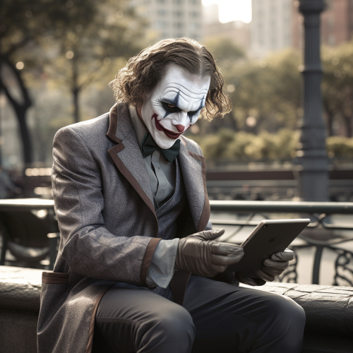 joker presenting tablet, sitting on city bench, daylight , front camera