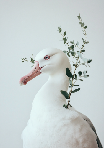 White background, studio photography of a white albatross with small greenery in its beak, minimalist, high-fashion style, cinematic, in the style of Tim Walker --ar 88:125 --v 6.1