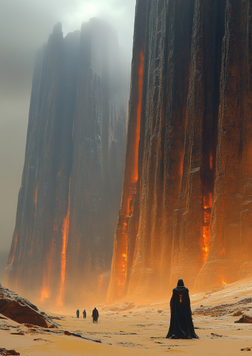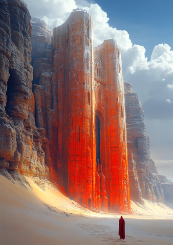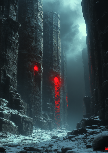 Moebius style, hypermaximalist, baroque, HDR Unreal Engine, cinematic lighting, Depth of Field, the ancient towers of the iced Desert on Haumea in the morning . Red light comes out of the cracks, scary statues along the walls --s 1000 --ar 5:7