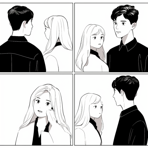 Create a comic style image with diagonally divided scene where a bald man is talking on the phone on one side and a woman with long brown hair is on the phone on the opposite side