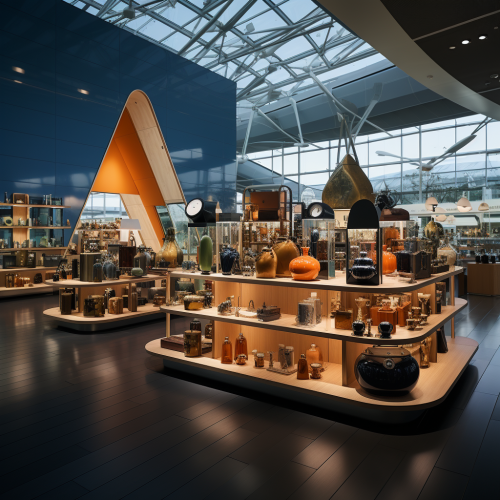 airport gift shop with a close angle, frontal shoot, empty shelves, Vitra shelves, Louis Poulsen PH5 pendant lamps, Sony A7R IV, 24mm f/1. 4 GM lens, soft accent lighting highlighting the products --s 250