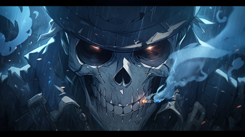 photorealistic shot of Jolly Roger with a cigarette in his mouth. digital lighting, high quality, high definition, high contrast --ar 16:9 --s 750 --niji 5