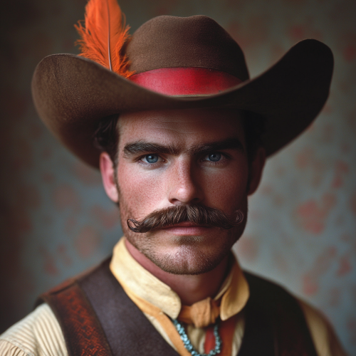 a portrait photo of a man who has a distinctive appearance with dark features, including sharp, focused eyes and a prominent, curled mustache that extends outward. His expression is serious and somewhat stern.He is wearing a wide-brimmed brown hat with a red band and a large, orange feather attached to the side, giving him a Western or adventurous look. His attire includes a yellow collared shirt underneath a dark brown vest. His hair is slicked back and gathered in a small ponytail at the back. The style and elements in his attire suggest a rugged, old-fashioned adventurer or cowboy character. He looks around mid twenties
