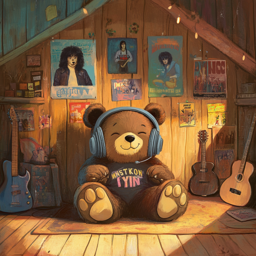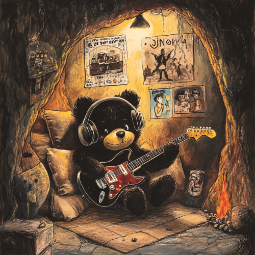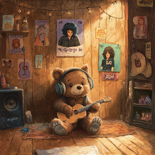 Illustration of a cozy bear cave. Jonny, a young bear, is sitting on the floor with large headphones, dreaming and pretending to play an air guitar. Posters of The Beatles, KISS, Elvis, and Queen are on the walls. The scene is warm and inviting, perfect for a children's book.