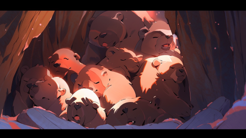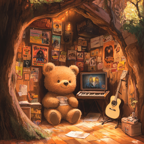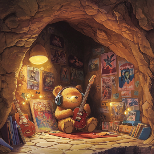 Illustration of a cozy bear cave. Jonny, a young bear, listening to music, Posters of The Beatles, KISS, Elvis, and Queen are on the walls. The scene is warm and inviting, perfect for a children's book.
