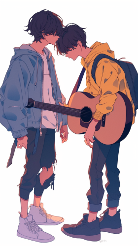 Two korean adult men with guitar, 4k, simple --niji 6 --ar 9:16