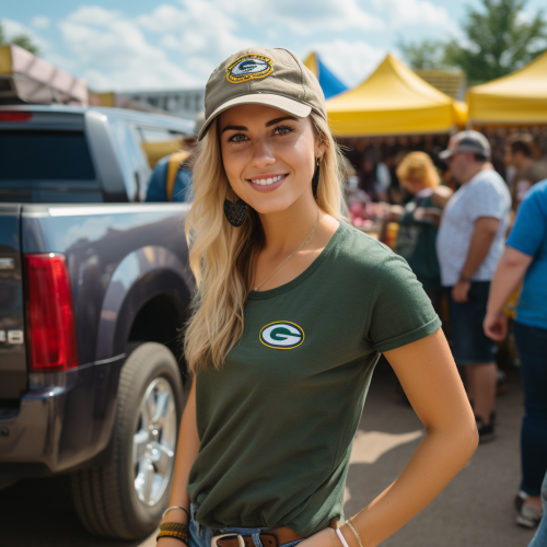 Extremely fashionable packers fan wearing solid baseball cap, intimidating people at a yard sale at tailgate party