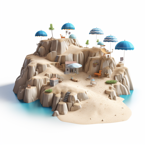 an isolated 3D world rock beach scene with sand castles and umbrellas floating on a white background