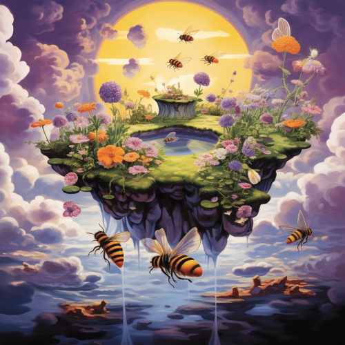 a surreal illustration of a floating island of honey and bees, New Yorker magazine art style, elegant, vivid colours, surreal, flying flowers, blue purple green clouds, elegant, magic animals