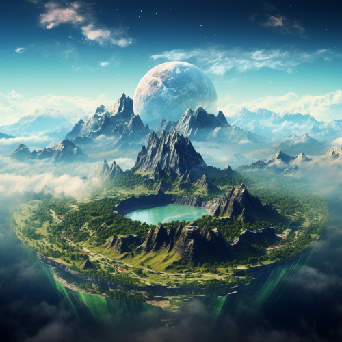 Opening scene of the imaginary planet with a floating mountain, "Imaginary planet landscape", "Floating mountain world", "Fantasy planet", global view from space