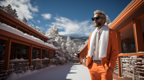 Christmas in a mountain resort in Asheville North Carolina. Snow covered mountains. Extreme blue skies. Snow covered mountains. Extreme blue skies. Extreme low angle camera shot. Looking straight up. Eccentric and Quirky characters dressed in Christmas attire in vivid colors against meticulously arranged neon symmetrical backdrop. High-end. Stylish. Black and white with color splash. Clean lines. Shot with a Pentax. K-3 III Monochrome. --ar 16:9 --q 0.5 --s 750