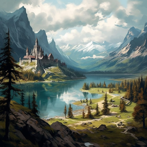 draw a landscape of a desolated yet impressive view with mountains, lakes and forests. It must have a fantasy medieval taste to it. ar - 16:9