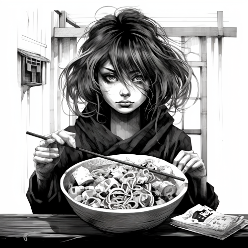 Joyful Japanese Lady with Noodle Hair Enjoying Ramen