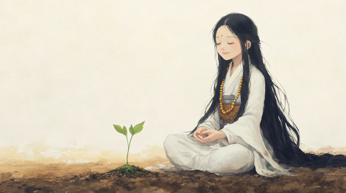 A 10-year-old Korean girl as a bodhisattva, with long black hair, in an oil painting style, sitting under a clear sky, with a gentle smile on her face. She has prayer beads on her wrist, kneeling down on rain-soaked earth where a single green sprout is emerging. The bodhisattva girl is looking at the sprout, capturing a sense of tranquility and wonder. The scene has a mystical, serene atmosphere, with rich, textured brushstrokes and vibrant colors. --ar 16:9