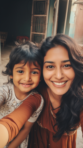 an iphone selfie of a smiling indian mother and daughter, summer clothes, half-body shot, wide-angle, clear facial features, Super-Resolution --ar 9:16