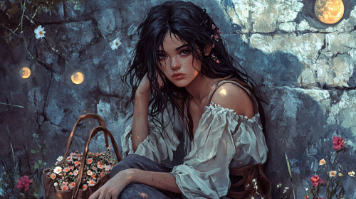 D&D watercolor, 4k, book art: a young woman with frayed and stylish black hair sits beside a stone wall with a bag full of flower petals. It is night, and there are 10 moons in the sky. --ar 16:9