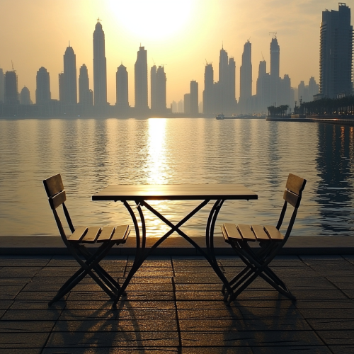 A simple, empty table stands near Dubai's Marine Drive, with the famous skyline and the buildings along the waterfront clearly visible in the background. The warm afternoon sunlight reflects off the water, illuminating the surrounding beauty of Dubai and creating a serene atmosphere. The table is ready for customers to choose products.