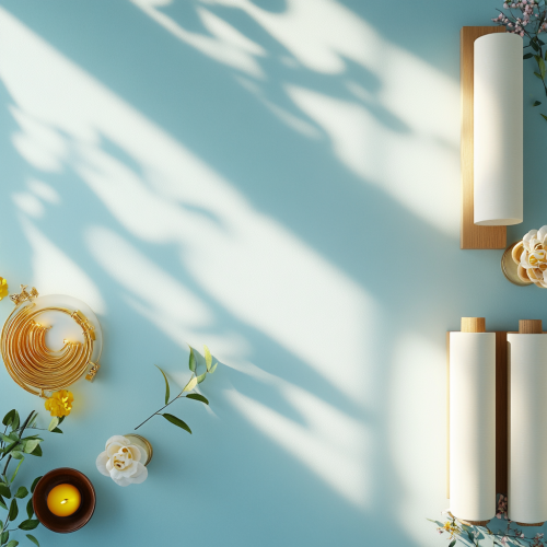 A wide, highly realistic image of a Simchat Torah holiday setup featuring a top-down view in natural daylight. The Torah scrolls, Hanukkah Menorah , shofar. The background is a light blue, creating a clean and fresh look under bright sunlight. The focus is on the symbolic elements of the Simchat Torah, with vibrant colors and natural shadows, giving the scene a more realistic, photographic appearance with the feel of a sunny day.
